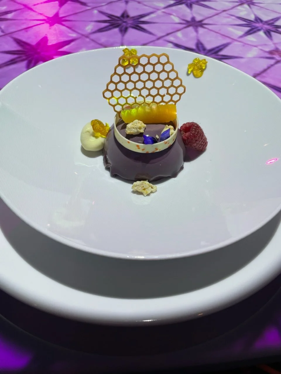 The dessert course, almost too pretty to eat, followed a video of a bee farmer who spoke of his passion for honeybees and producing honey. The honeycomb garnish sat atop a creamy lavender cake with a honey crust. The honeybee gummies were a cute touch around the plate.