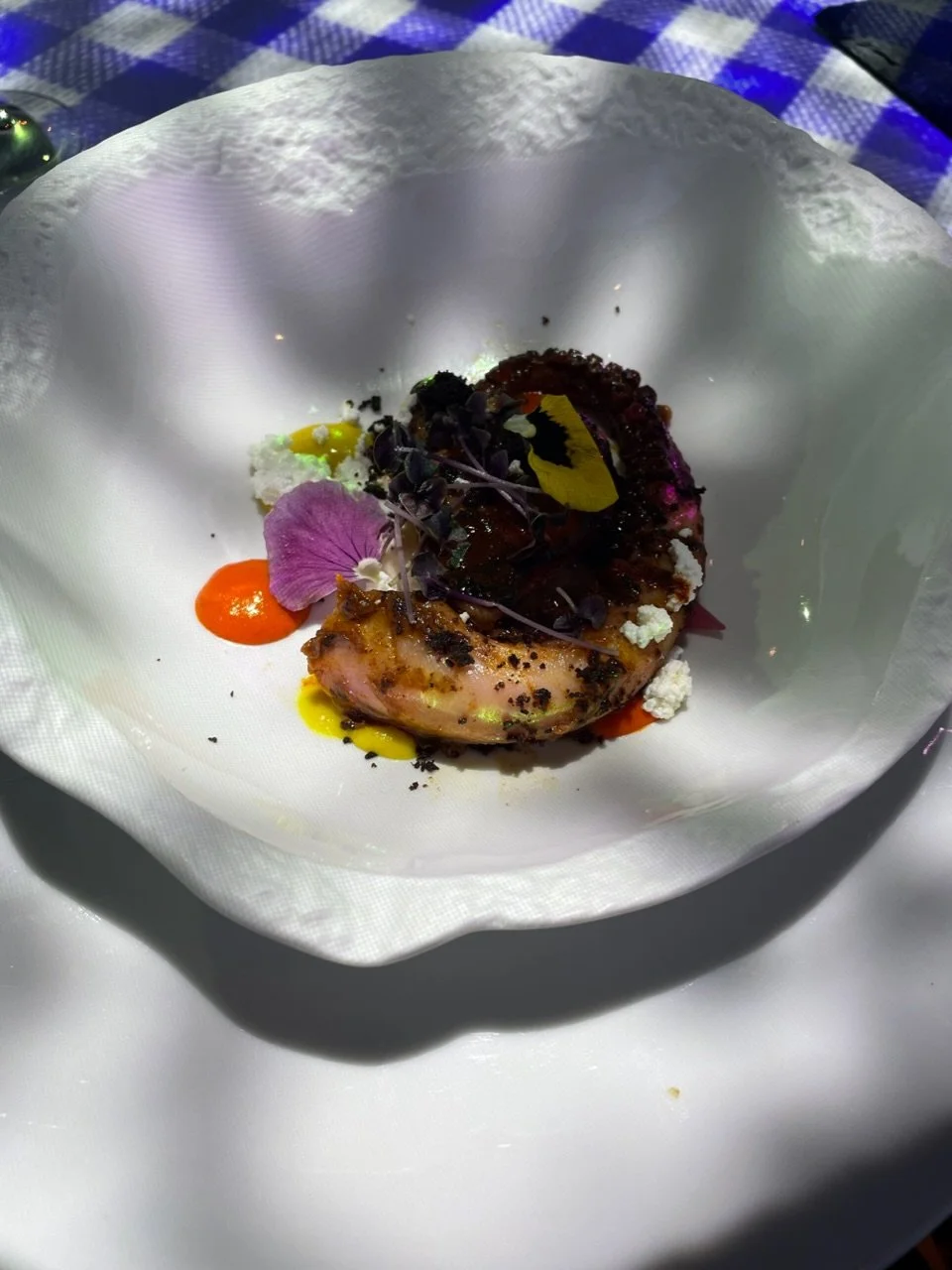 Lovely presentation of the grilled octopus with feta and coulis with an edible flower garnish.