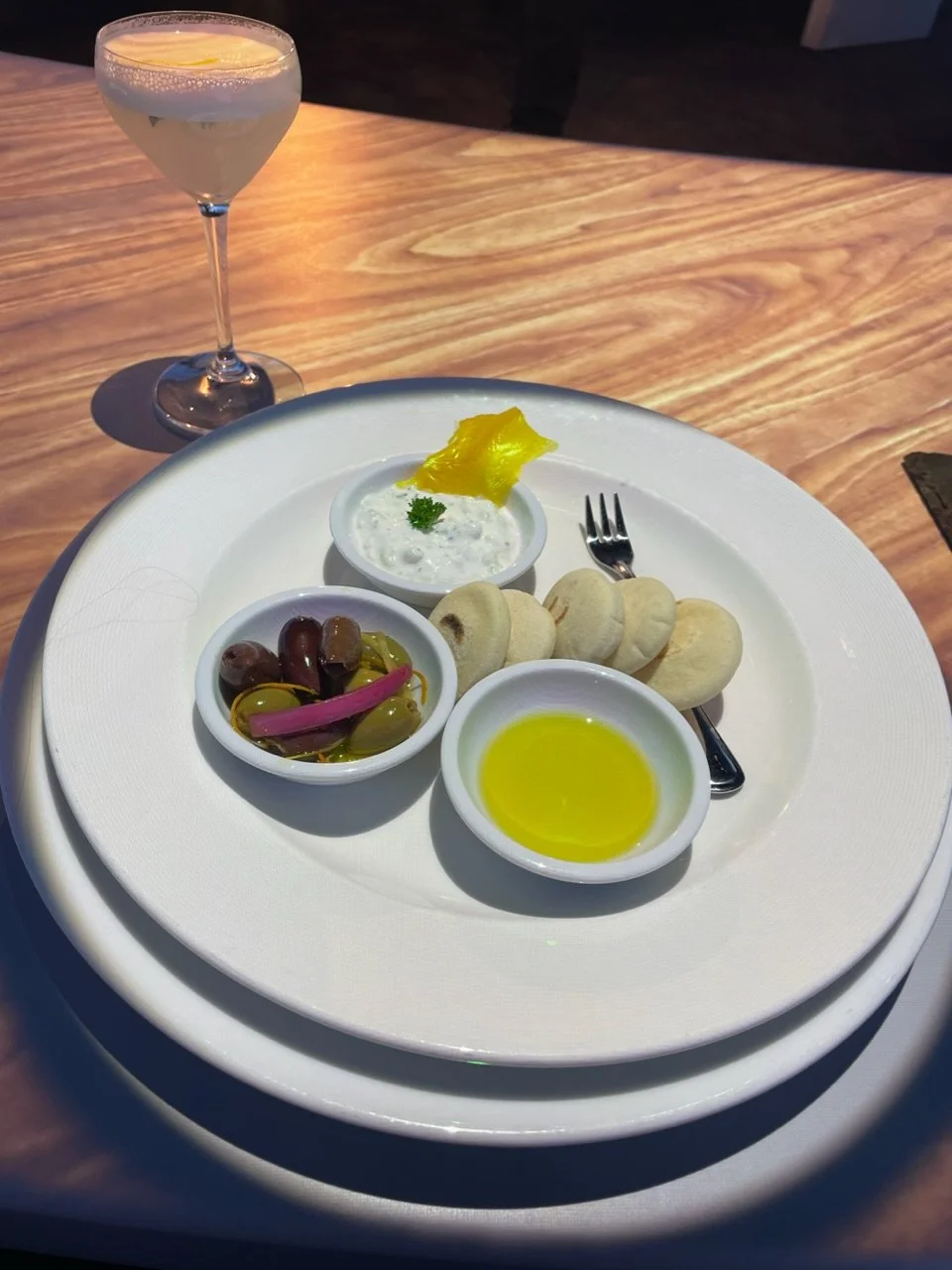 The Greek course with fruity olive oil, mini pitas, tzatziki and briny multi-colored olives.