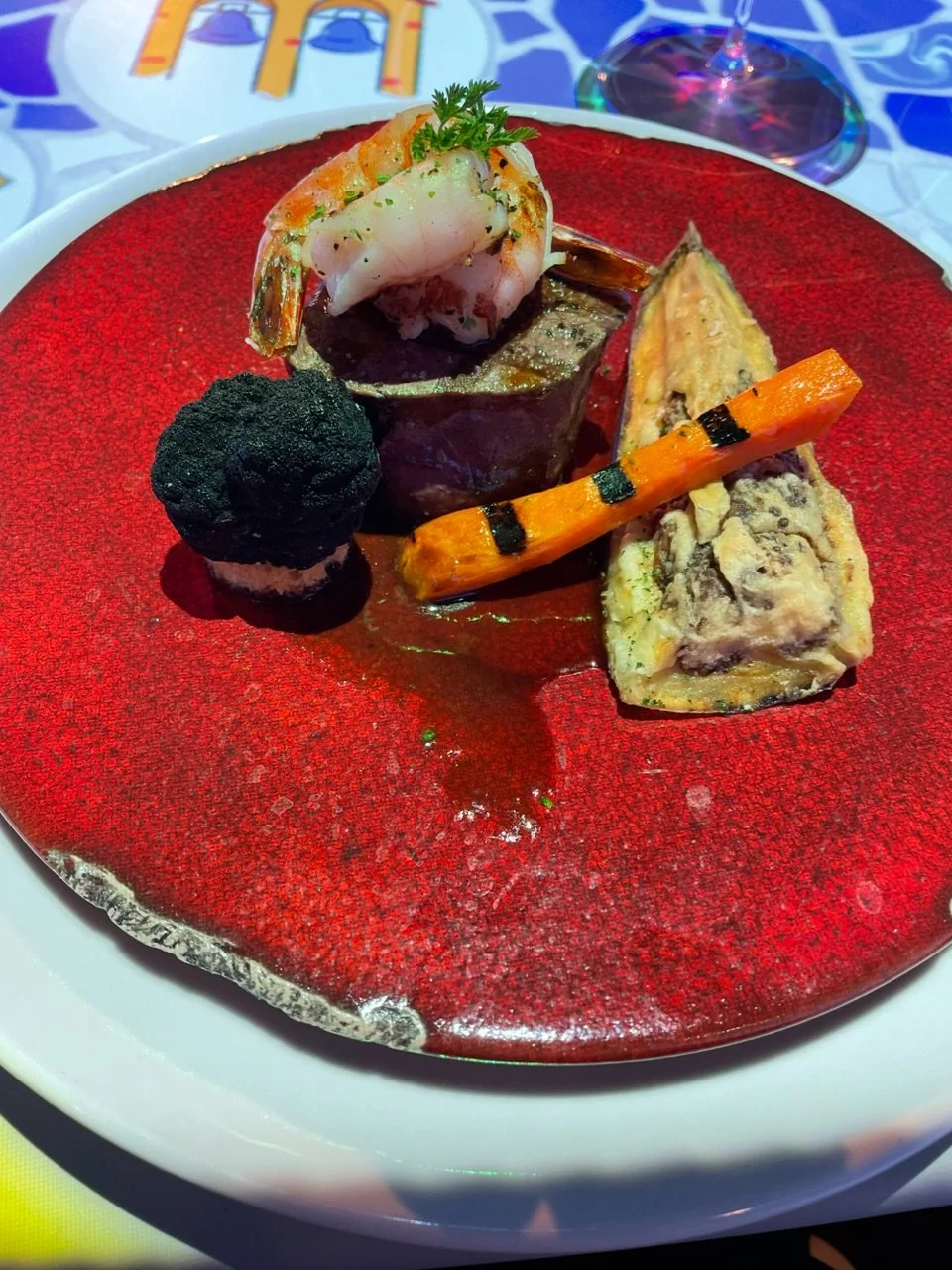 After watching the heartwarming video of the truffle farmer and his truffle finding canine companion traipsing through the woods, we were presented with the main dish. Grilled prawns set atop a perfectly cooked filet mignon with truffle butter, grilled carrot and eggplant. The rustic, deep red colored dish was a real eye catcher.