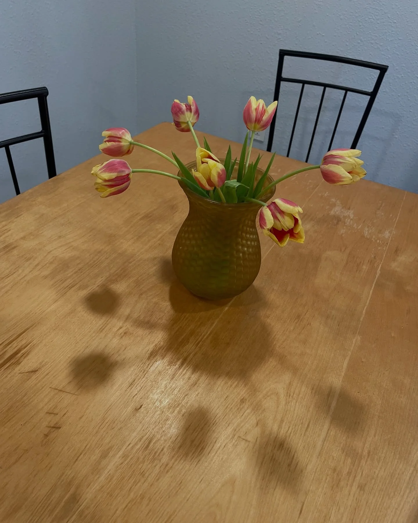 And a final photo of some Spring tulips I bought for the townhouse in a cute thrifted vintage vase.