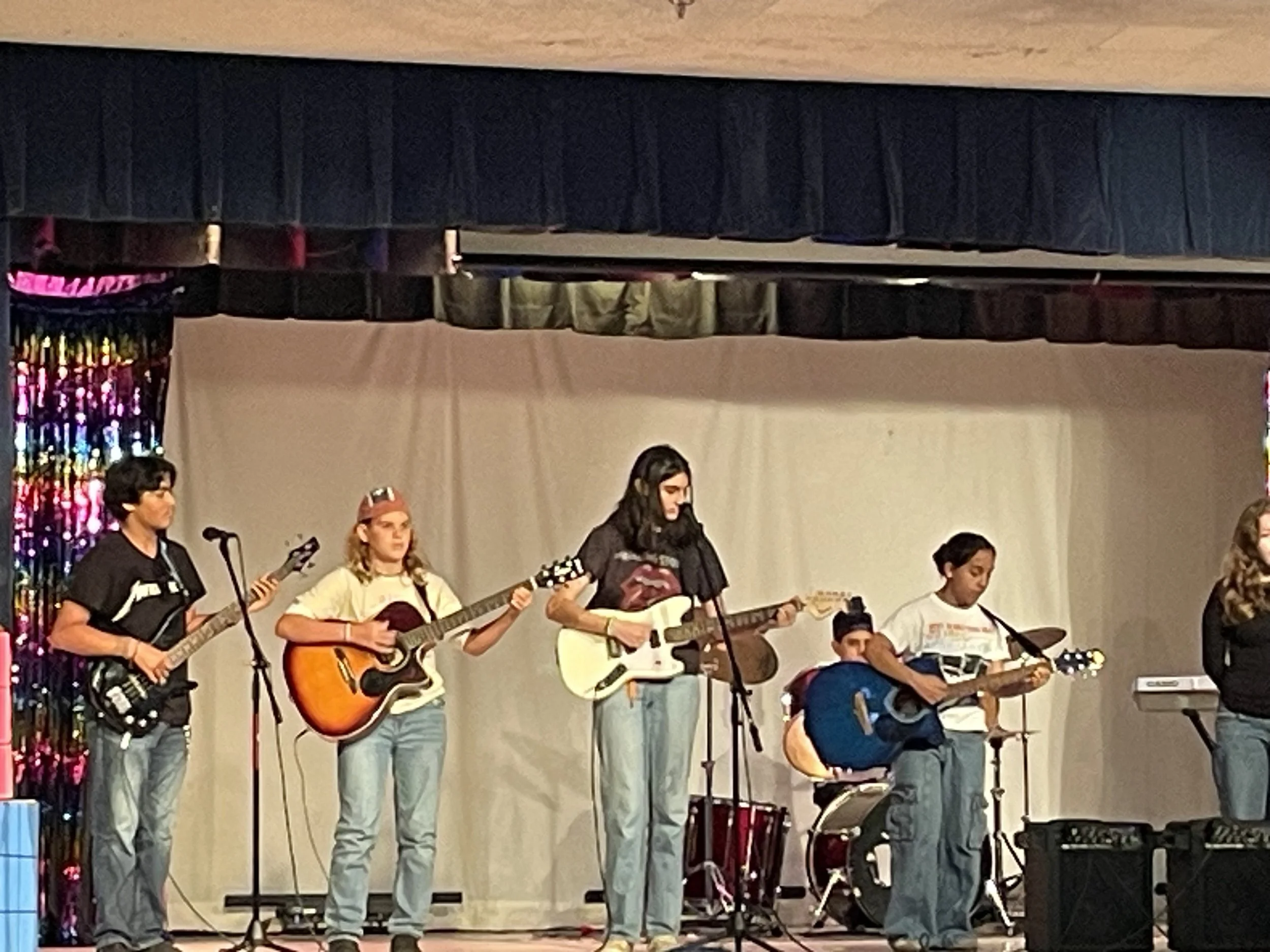 Kaitlyn on the white guitar in the black shirt playing lead on one of many songs while doing double duty as stage manager for the show.