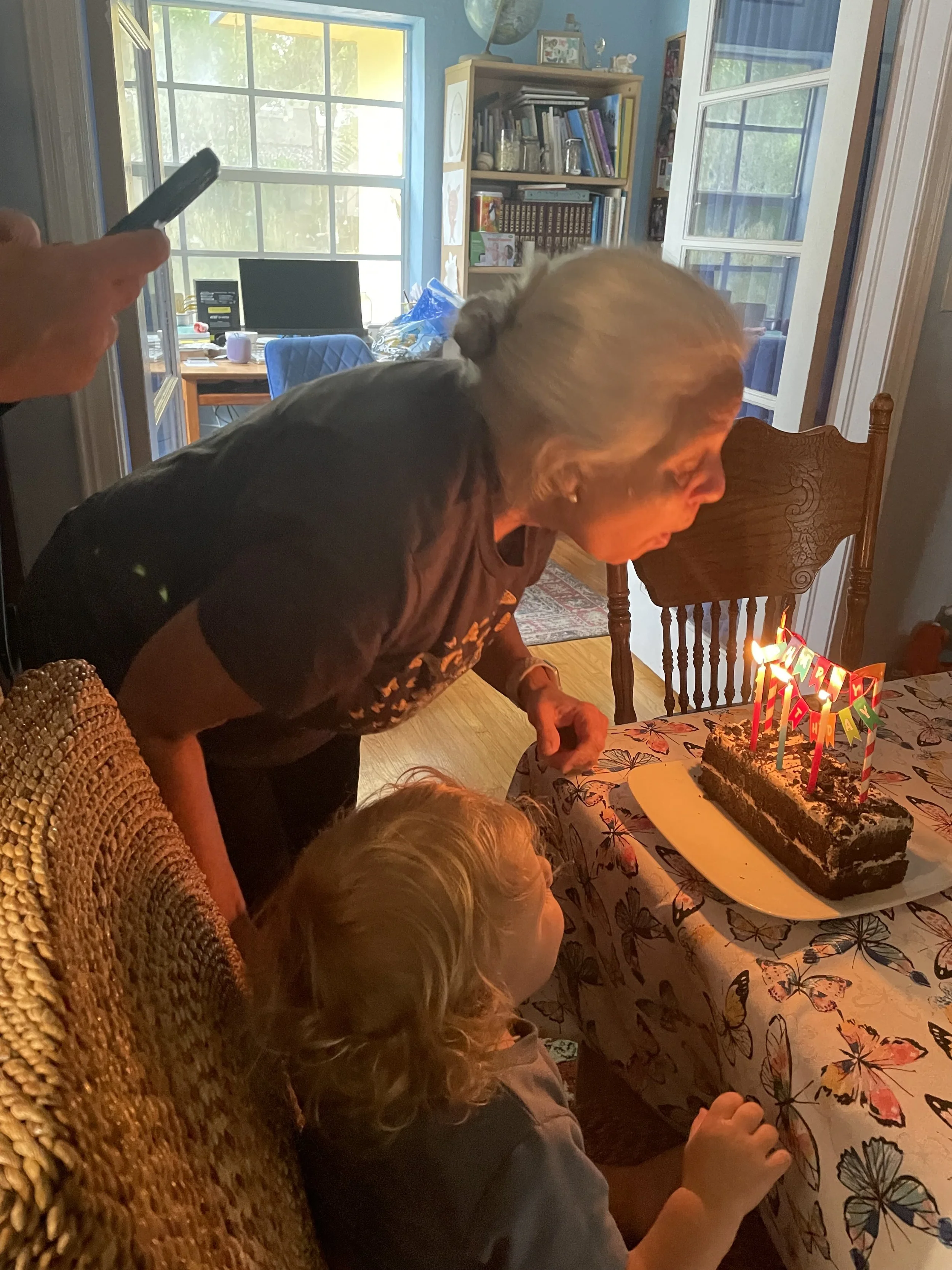 Susy gets some help from grandson Jojo to blow out her birthday candles.