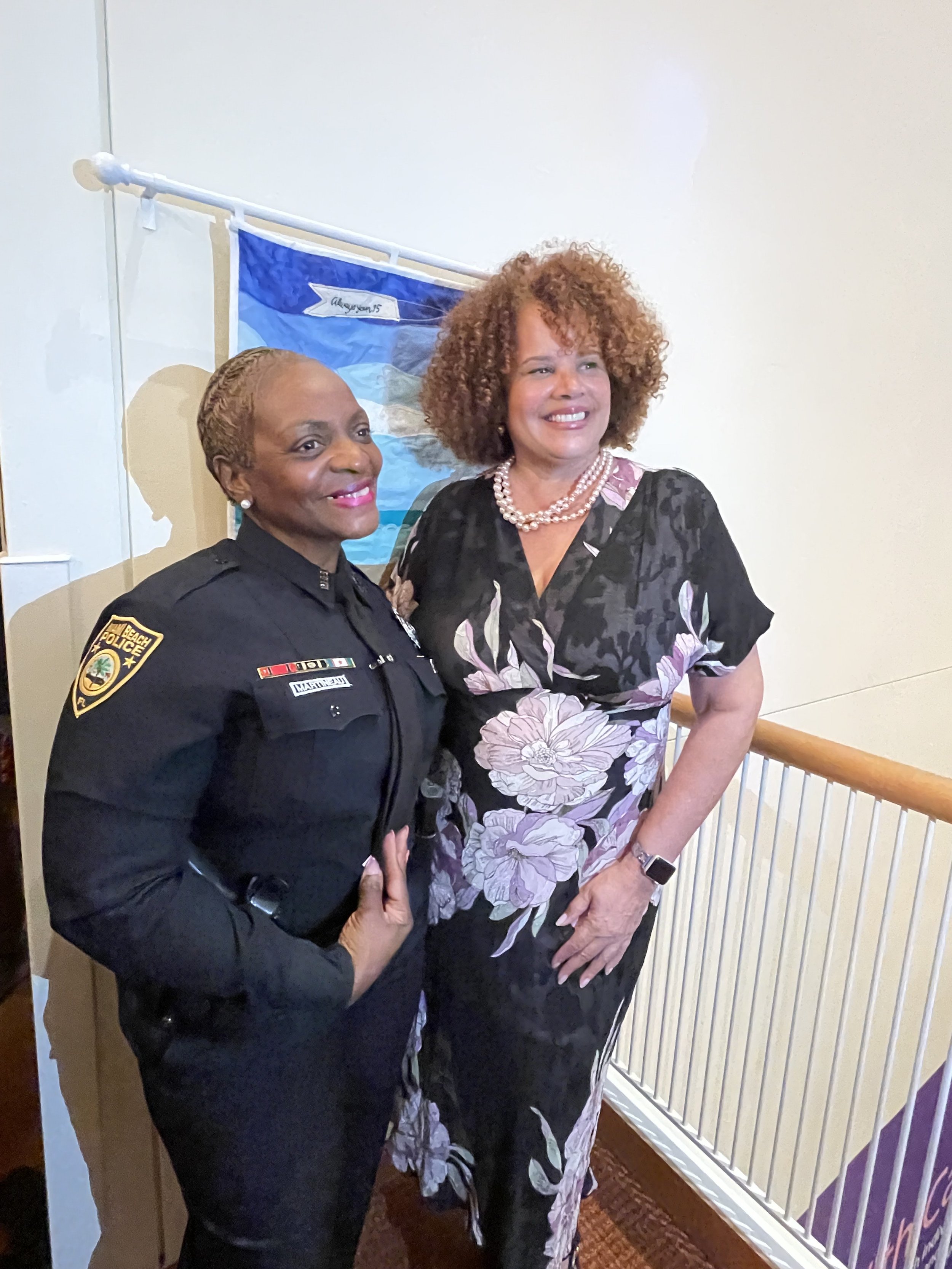 That is artist Rosa Henriquez on the right in front of her artwork and Miami Beach Police Officer Deborah Martineau, a cancer survivor and caregiver who was her inspiration for the piece at the Arsht Center last night.