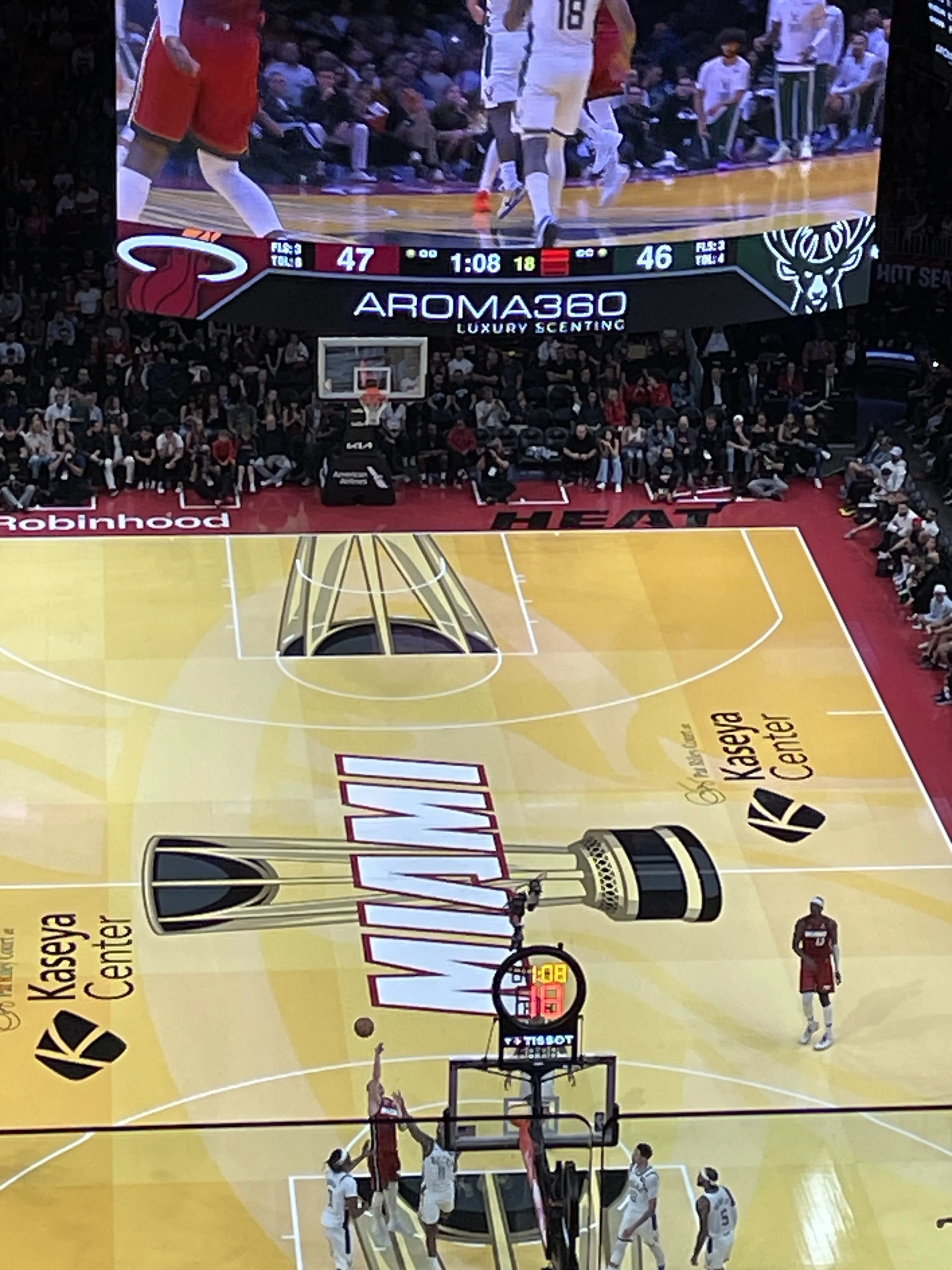 The Miami Heat in action against the Milwaukee Bucks at the Kaseya Center in Downtown.