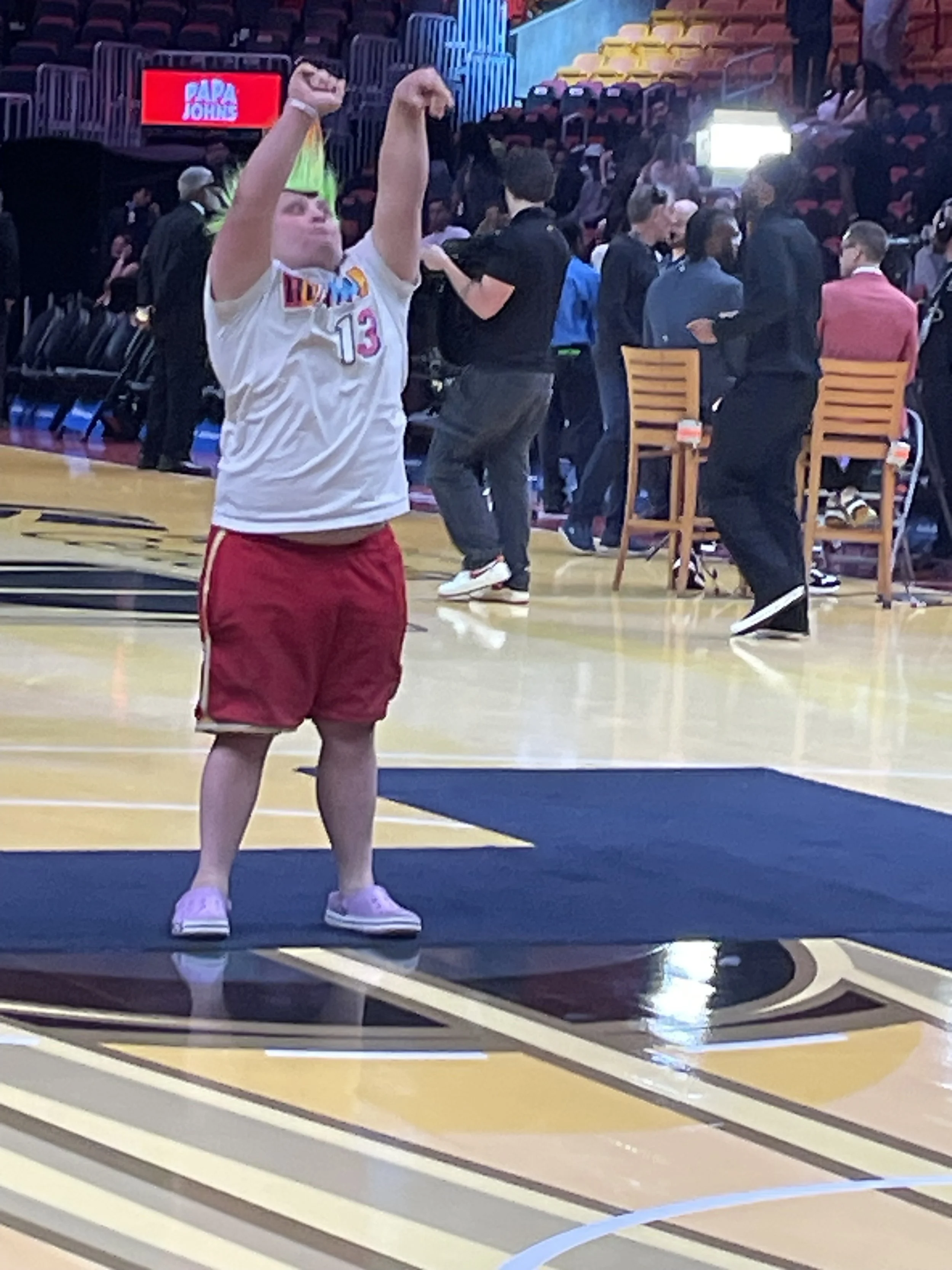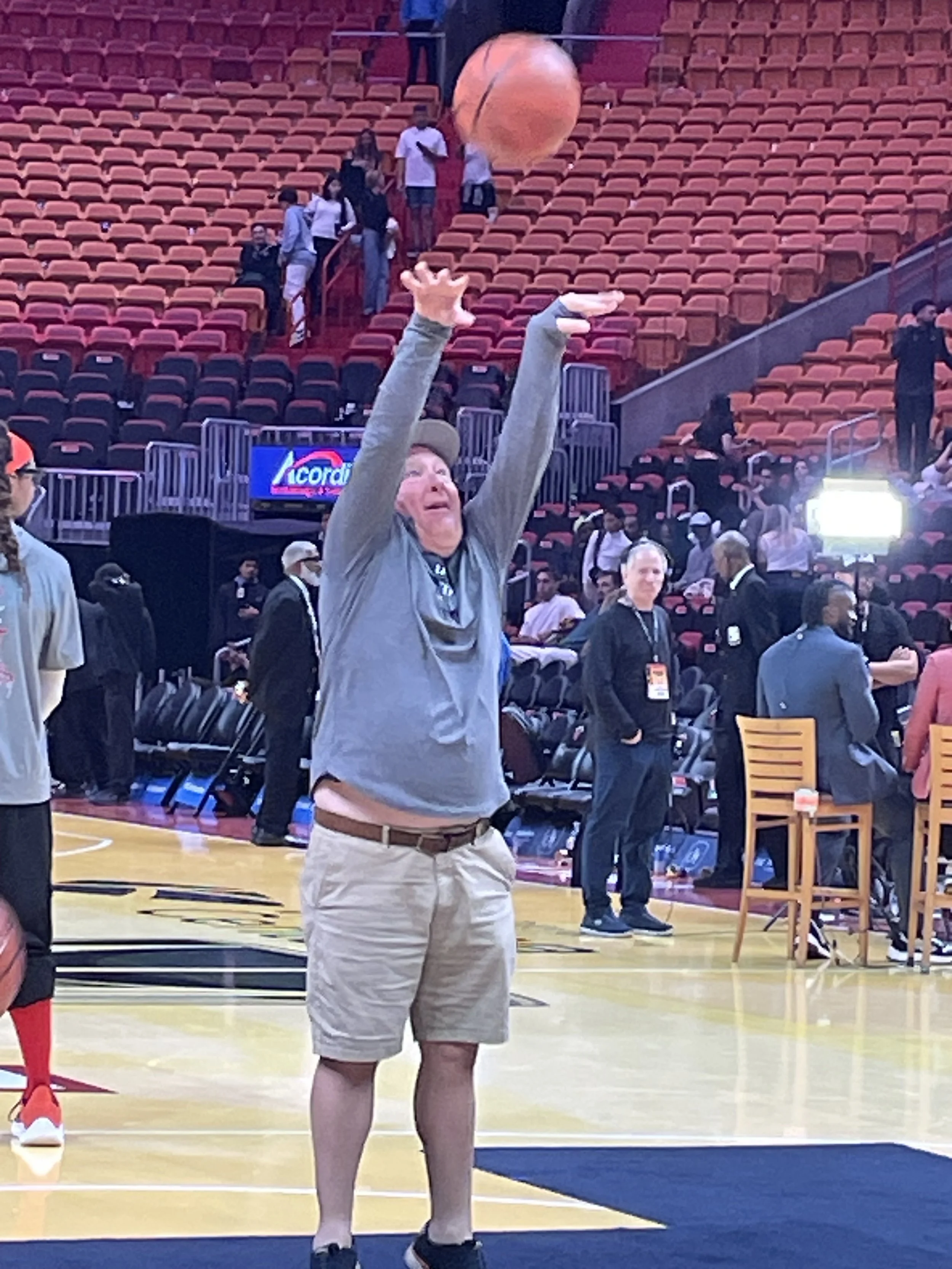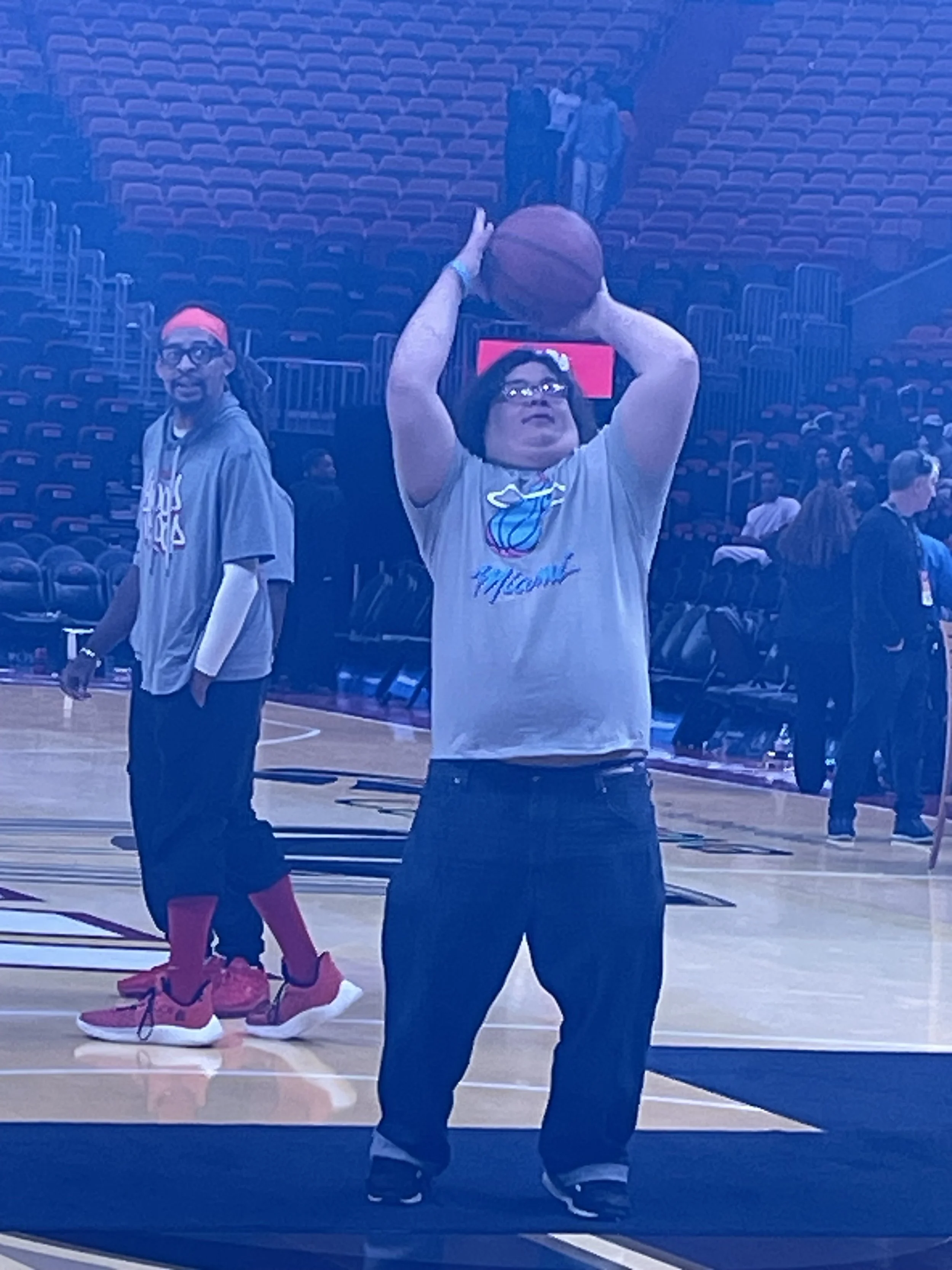 Wednesday night Vance, Nick, Michael and I went to the Miami Heat game. Because it’s Thanksgiving week they had a great special, 2 for 1 tickets so we scored four tickets in the 400 section for $60! We had a great time watching the Heat beat the Milwaukee Bucks in a nail biter of a game. Afterwards, Michael got the hook up through his friend who works security at the arena and we all got to walk down to the court. I opted out of trying to make a free throw but Vance, Michael and Nick did and Nick of course, made his shot in!