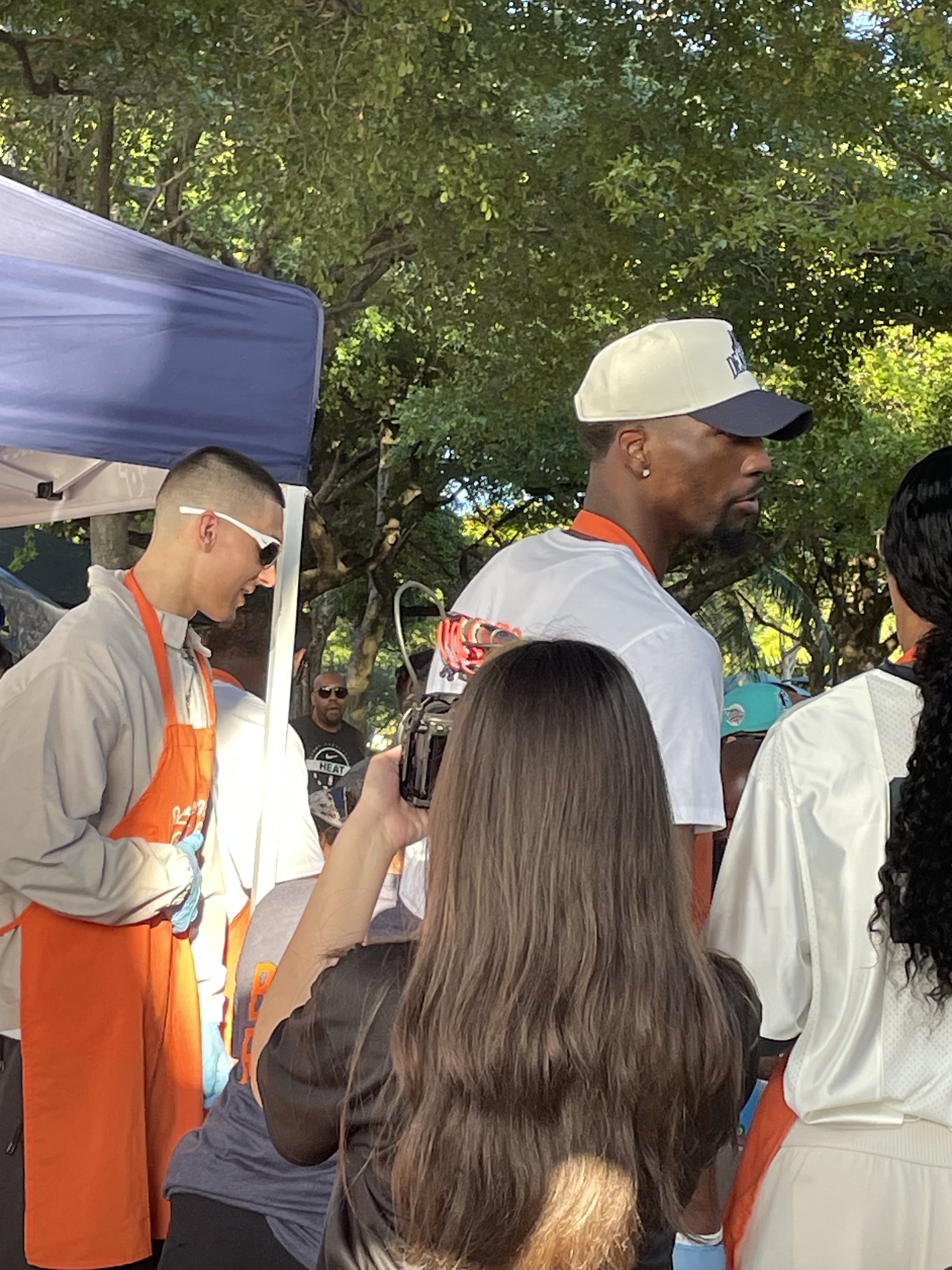 Tyler Herro in sunglasses and Bam Adebayo at Thanksgiving Farmer’s Market at Charles Hadley Park.