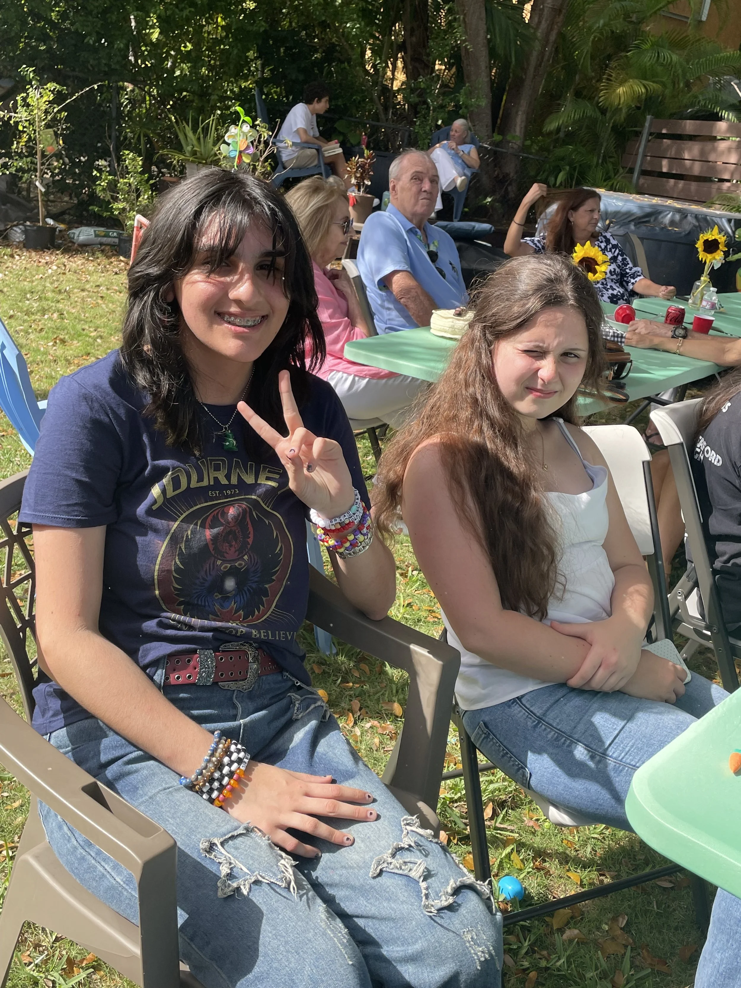 Kaitlyn throwing up the peace sign and Mia at Easter Sunday.