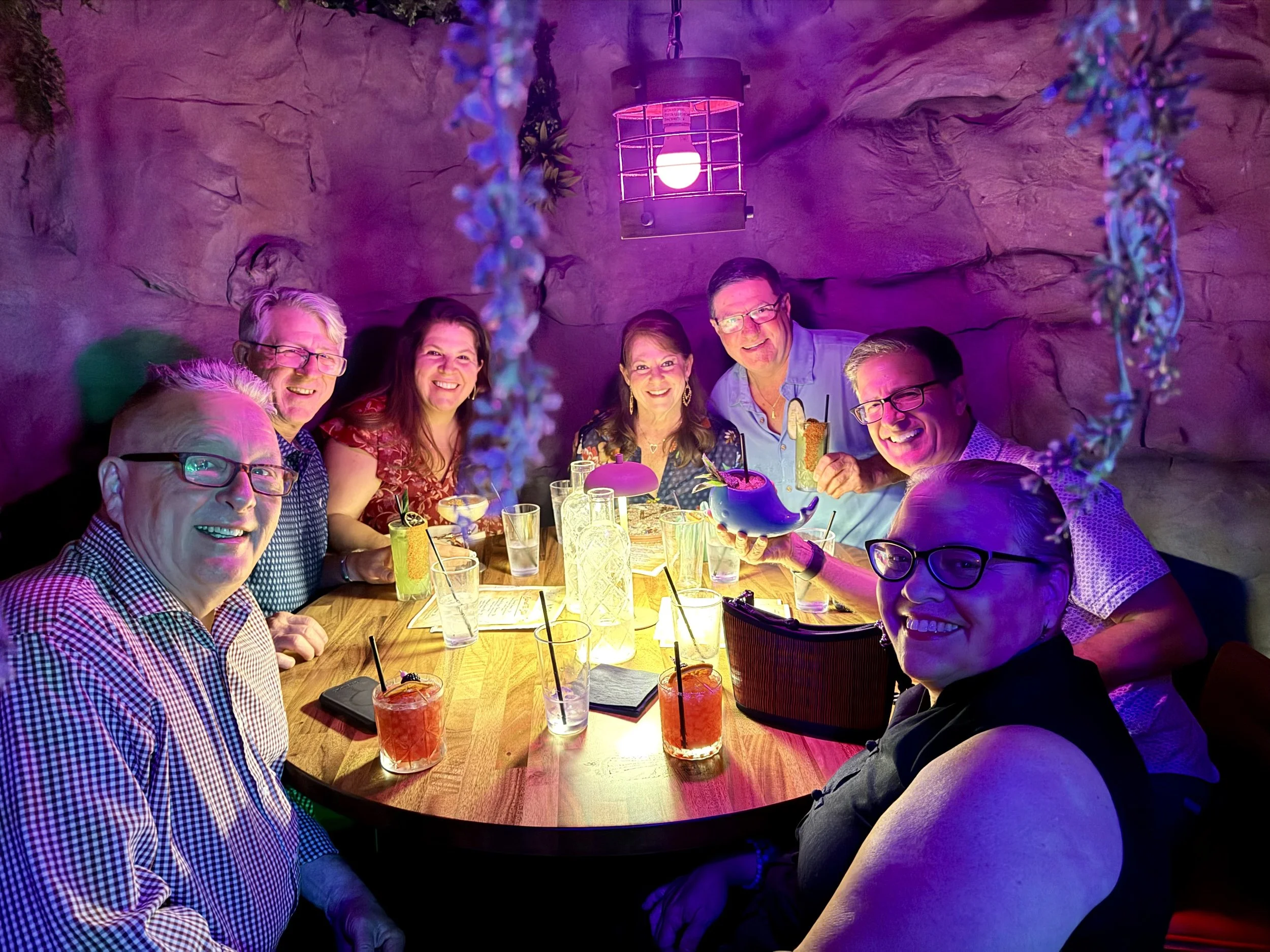 Here we are (don’t mind the fake plant that looks like it’s growing out of my head) L-R Vance, Kevin, Michelle, Adina, Rick, Phil and I at Speak-Tiki.