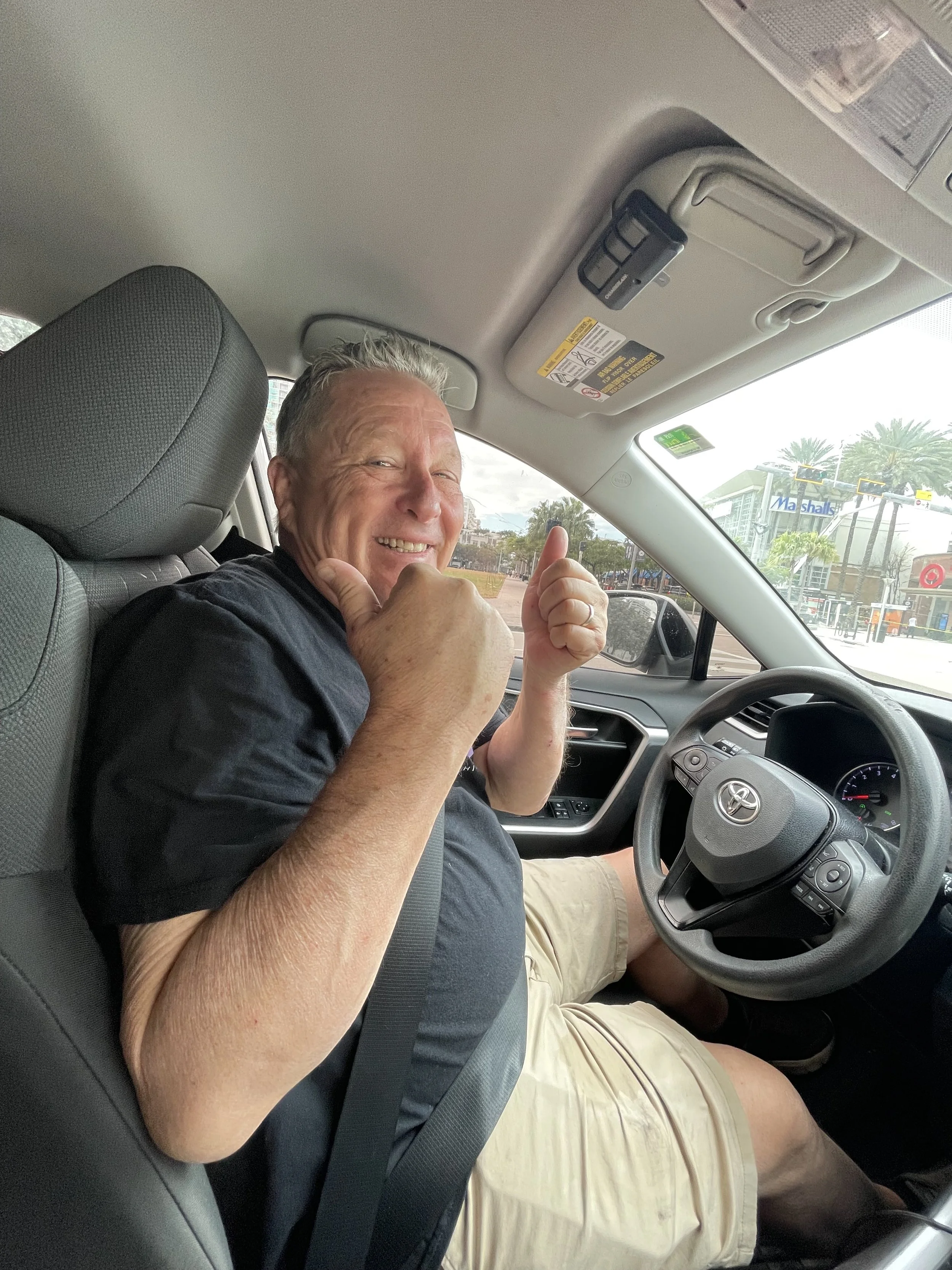 Vance gives a thumbs up after we loaded the car to the tippy top as we drive off to deliver the goods to Village Freedge.